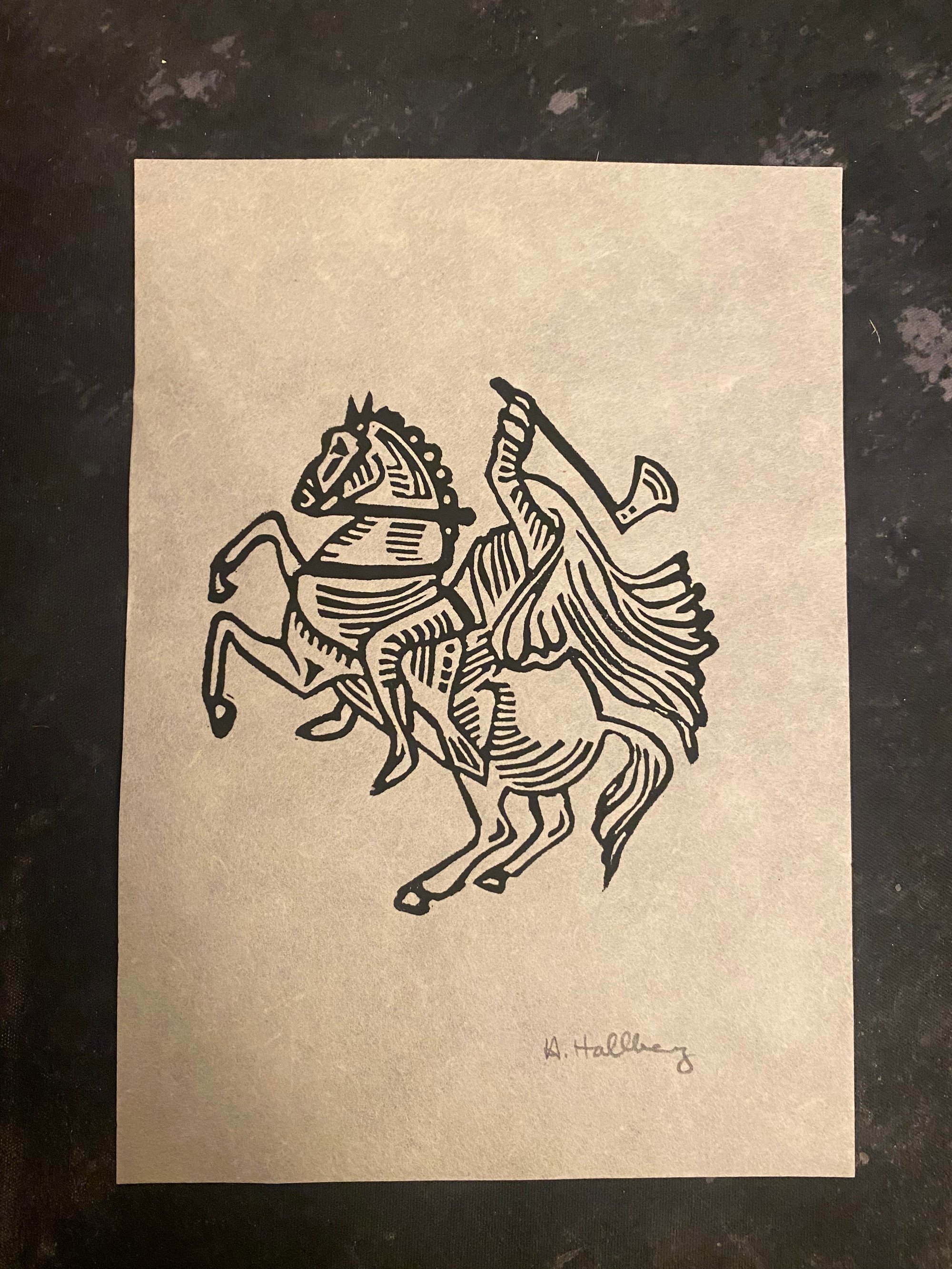 Headless horseman from Sleepy Hollow rides again. Hand drawn, hand carved, hand printed by me.