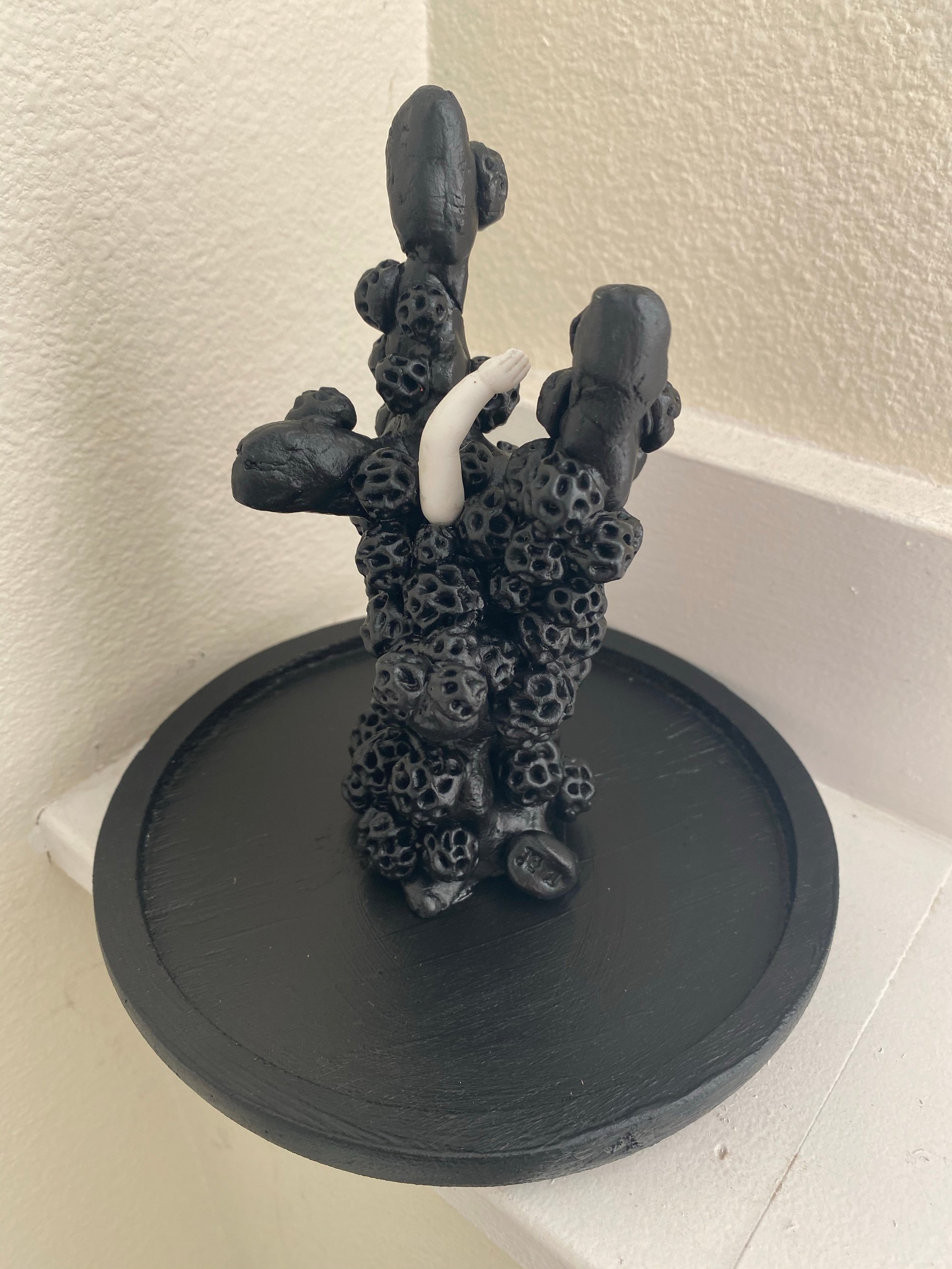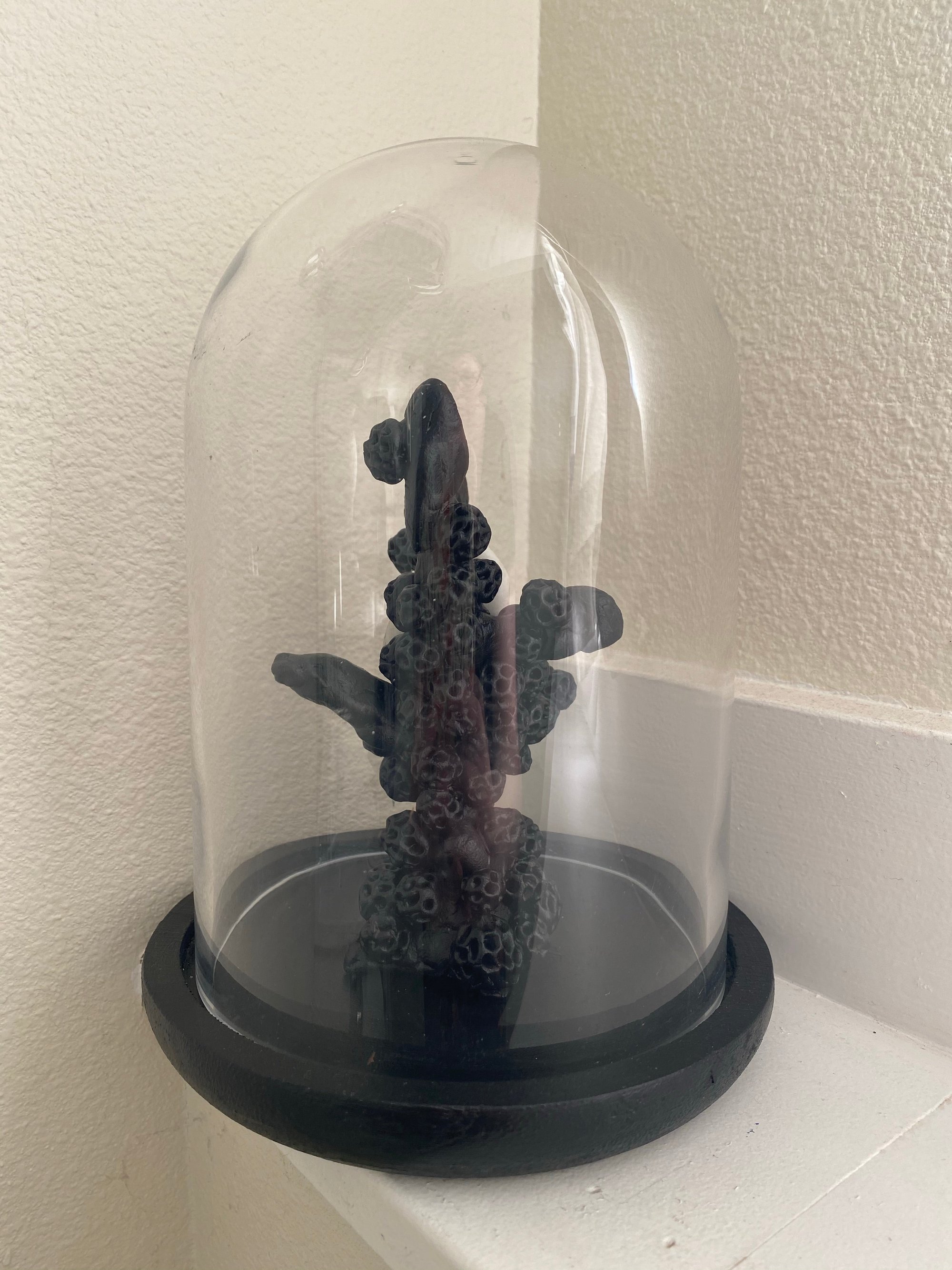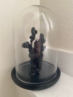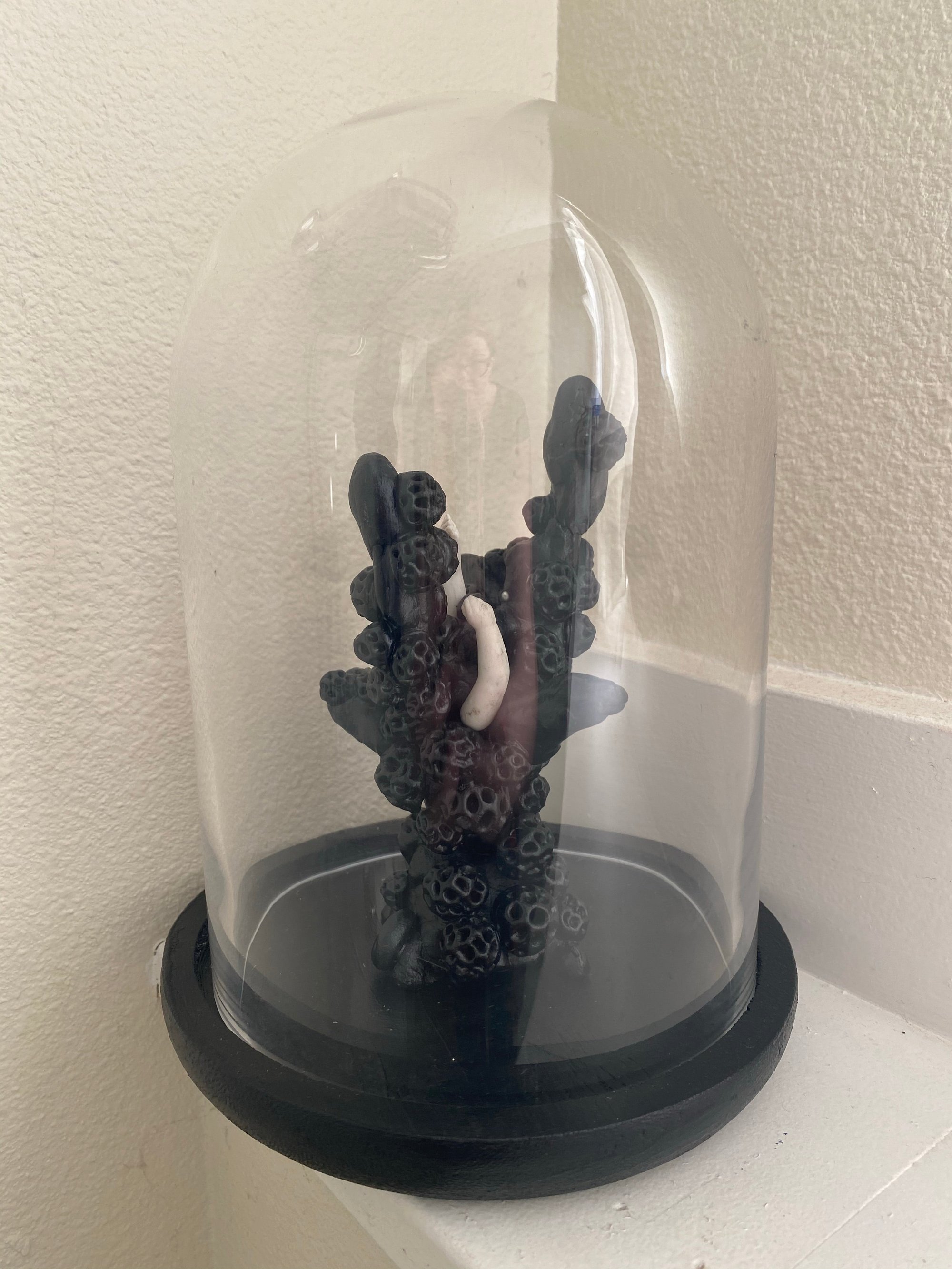 Paperclay sculpture, excavated antique German porcelain doll arms, acrylic paint, mixed media in a glass cloche