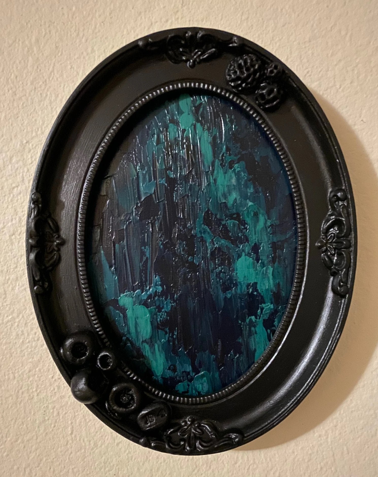 Acrylic painting in vintage frame, paperclay details, mixed media, glass