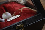 Housed in a wood and glass box reliquary, displayed on a red velvet pillow, sealed with jute and a red wax seal, finished with small white paper flowers.