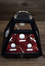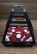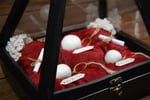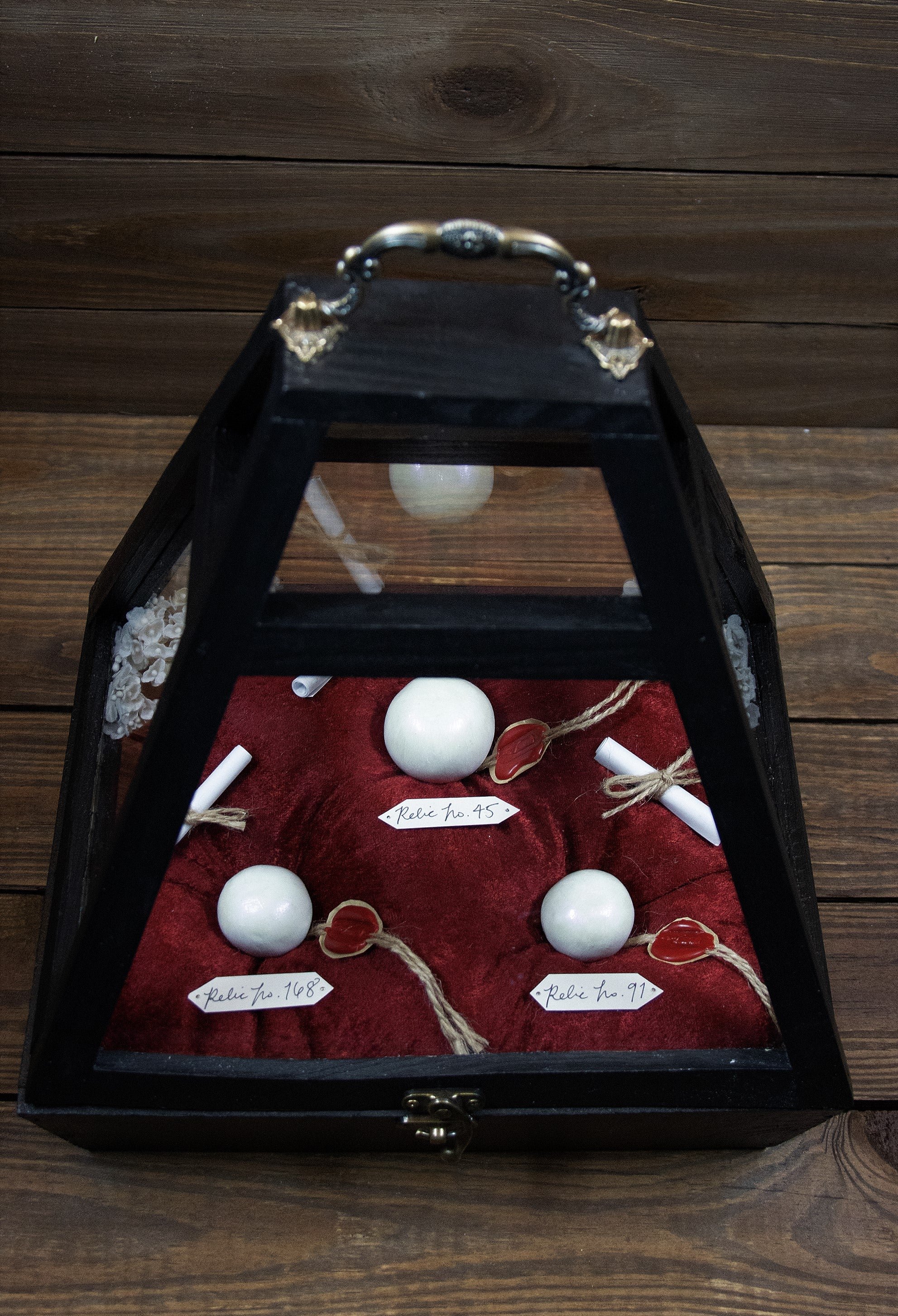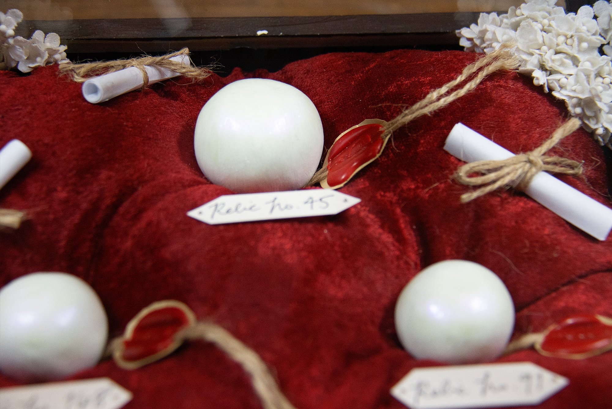 All three pearl relics are housed in a large wood and glass box reliquary, displayed on a red velvet pillow, sealed with jute and red wax seals, finished with small white paper flowers.
