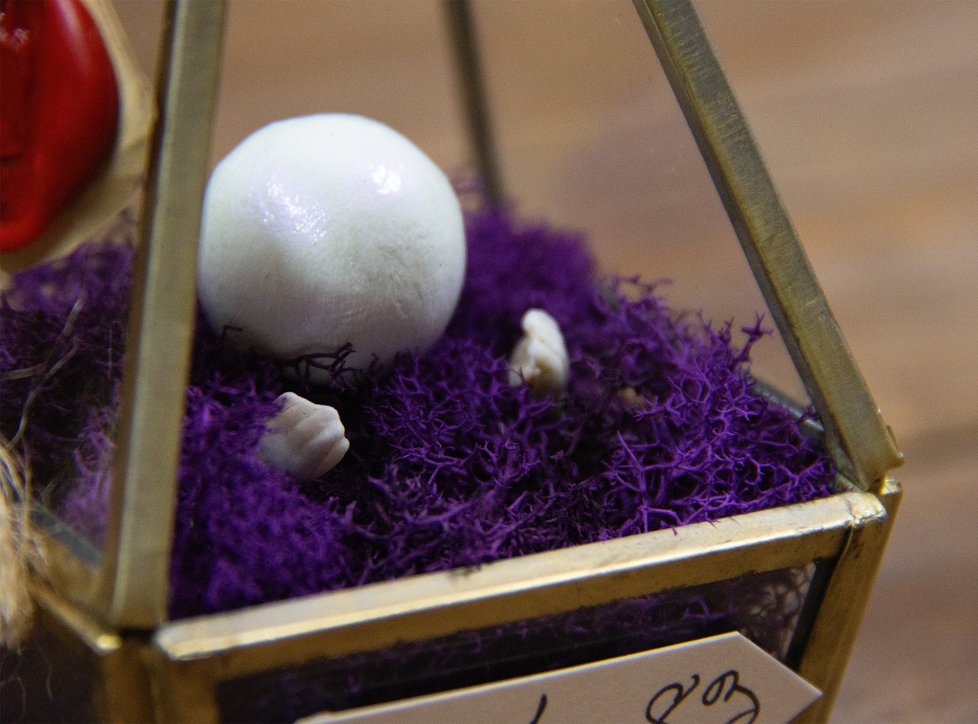 Housed in a glass reliquary filled with violet moss, cradled by excavated antique German porcelain doll arms, sealed with jute and a red wax seal.